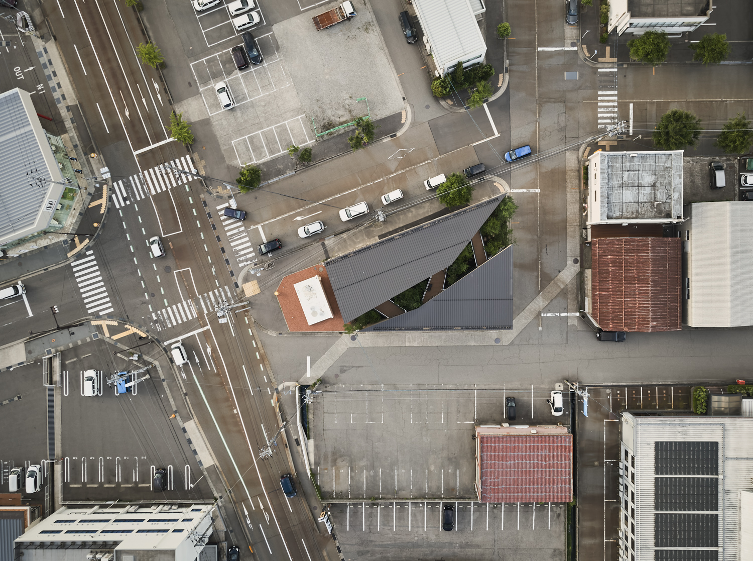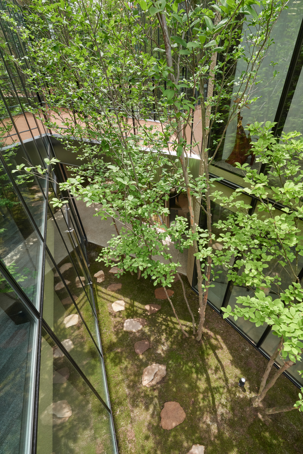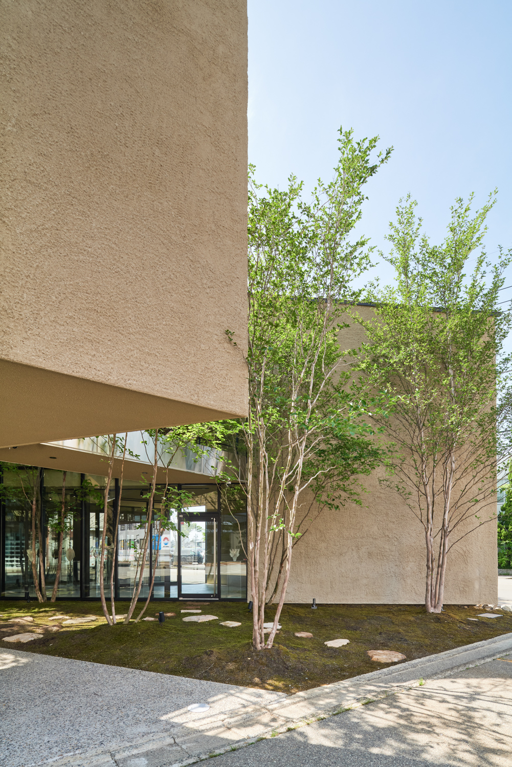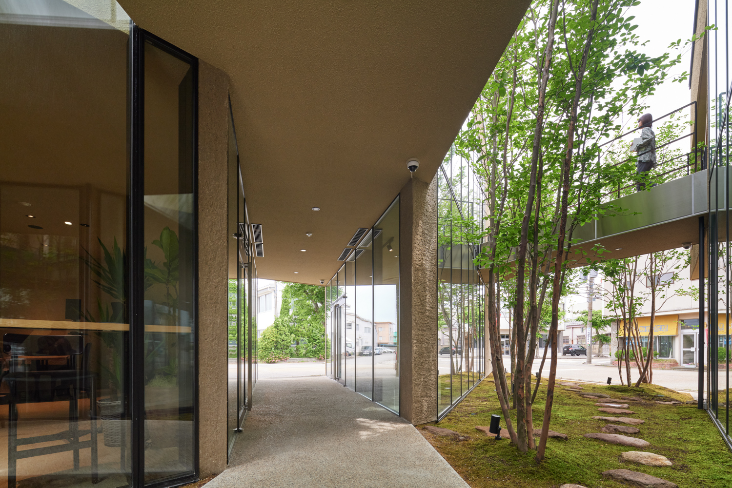 緑道デザインは敷地近くに存在する「西田家庭園 玉泉園」(石川県指定名勝)を参照。回遊性ある茶室露路空間を拠り所に植栽デザインは西畠清順(そら植物園)に依頼をし、設計プロセスにおける「釉薬」フェーズとして化学反応や劇薬として期待します。コロナ禍を経た、次世代型シェアオフィスとして新しい建築イメージの提案です。(奈良祐希)