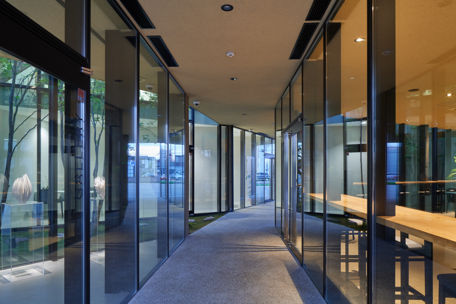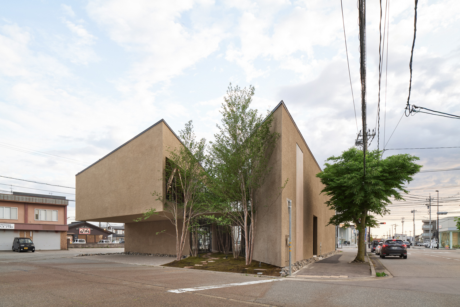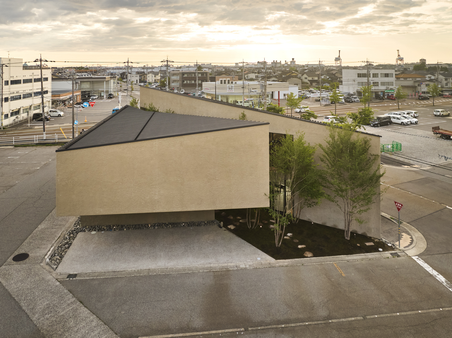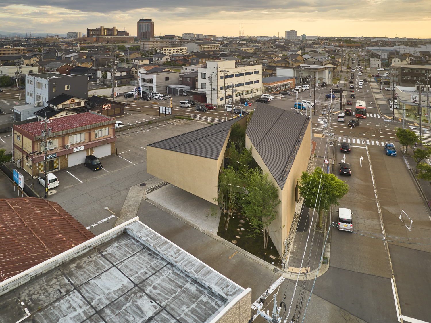 緑道デザインは敷地近くに存在する「西田家庭園 玉泉園」(石川県指定名勝)を参照。回遊性ある茶室露路空間を拠り所に植栽デザインは西畠清順(そら植物園)に依頼をし、設計プロセスにおける「釉薬」フェーズとして化学反応や劇薬として期待します。コロナ禍を経た、次世代型シェアオフィスとして新しい建築イメージの提案です。(奈良祐希)