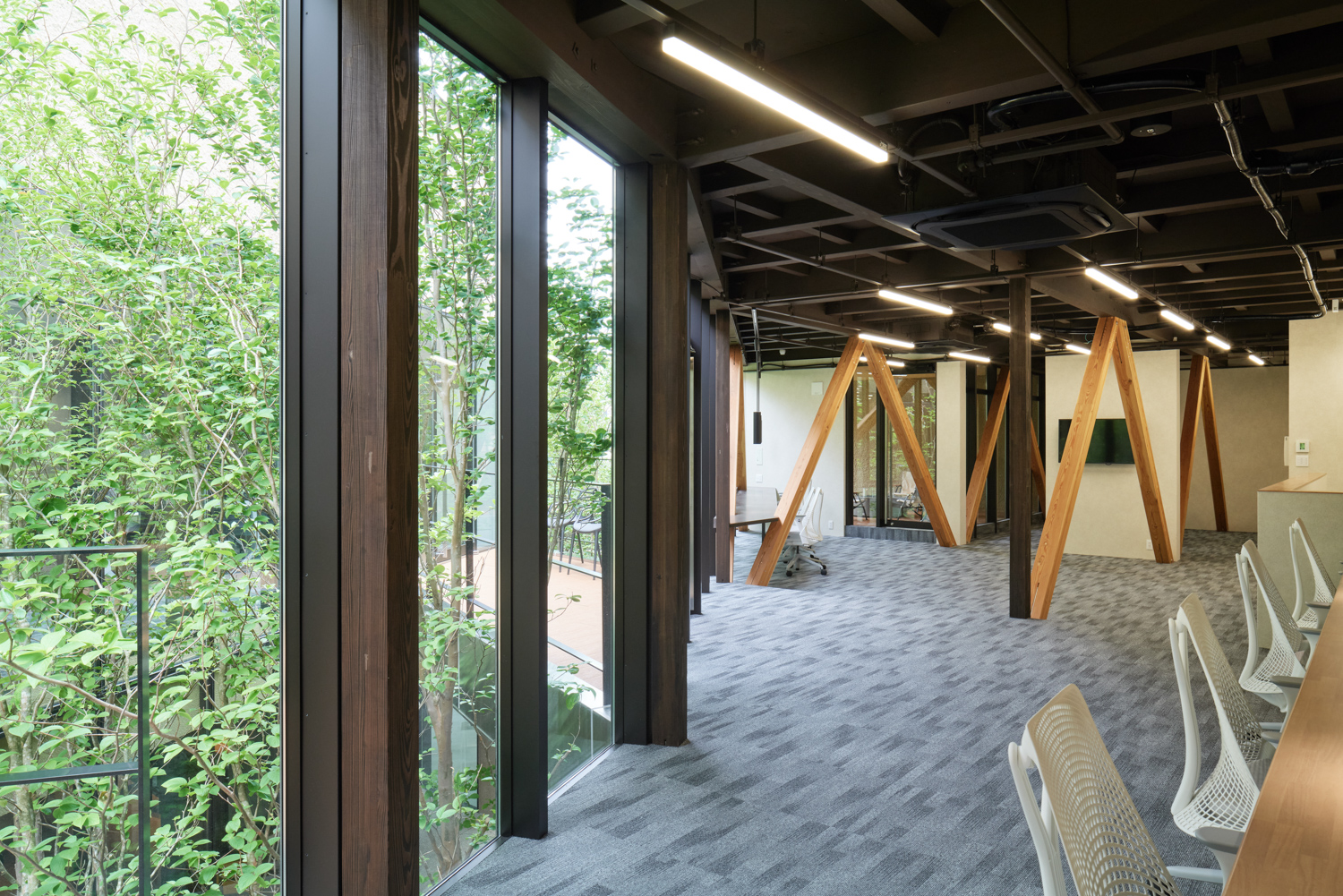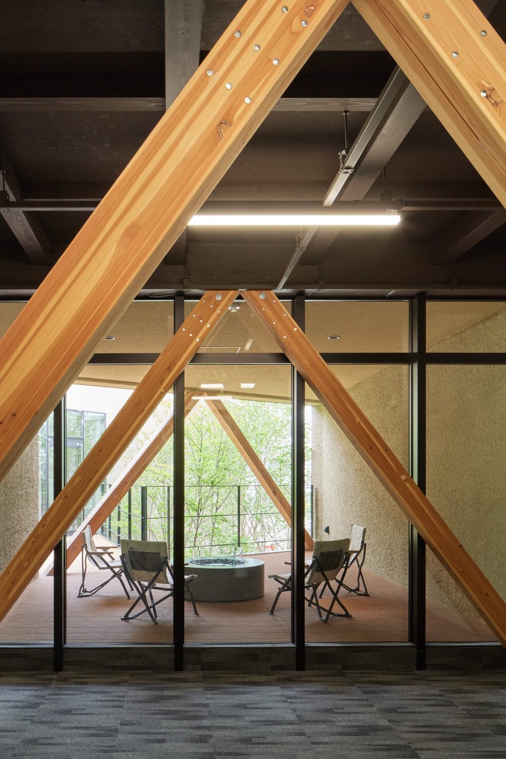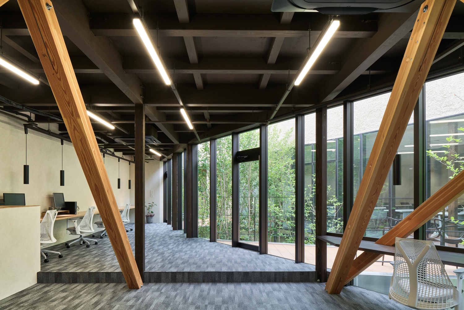 2つの性格の異なるオフィス空間を「パッサージュ(渡り廊下)」が緩やかに繋げていきます。周辺環境のコンテクストで最大の特徴である「キャンチレバー(片持ち)」を実現するために、オーノJAPAN(東京都)に構造設計を依頼。木造トラス架構を各所に配置することで、約5mのキャンチレバーを実現します。