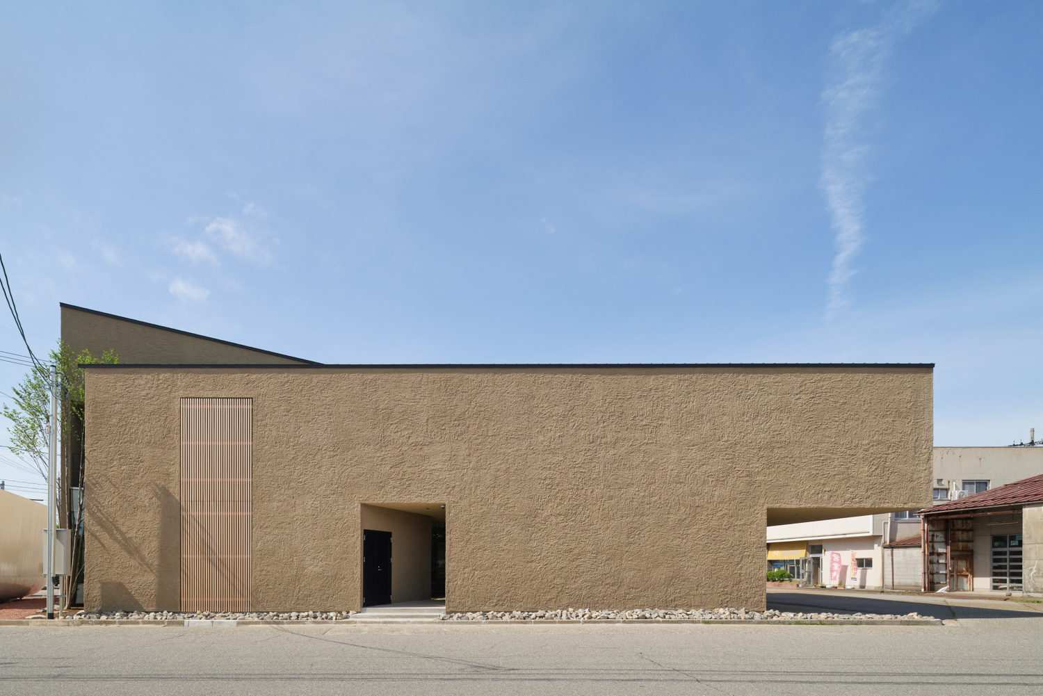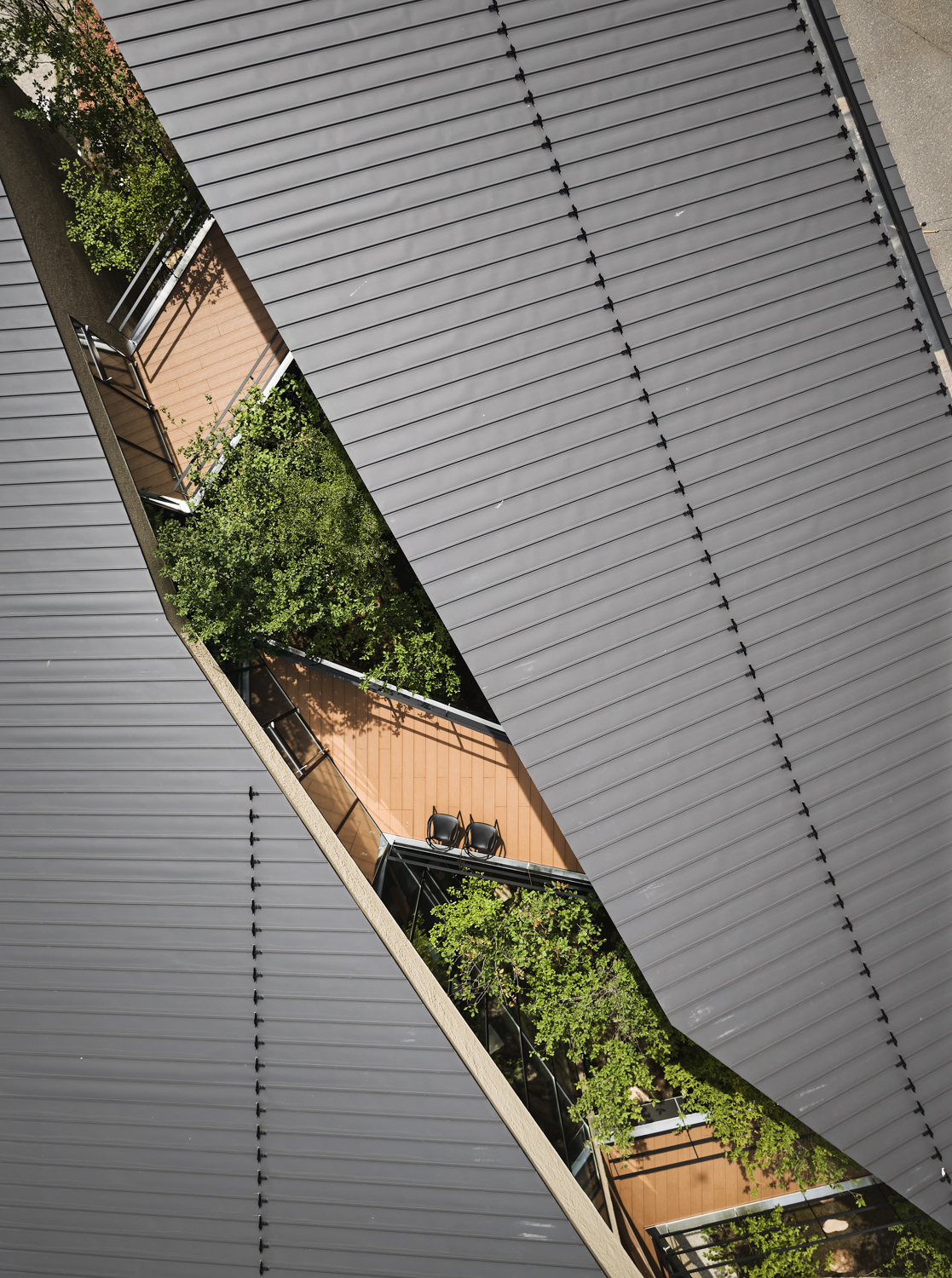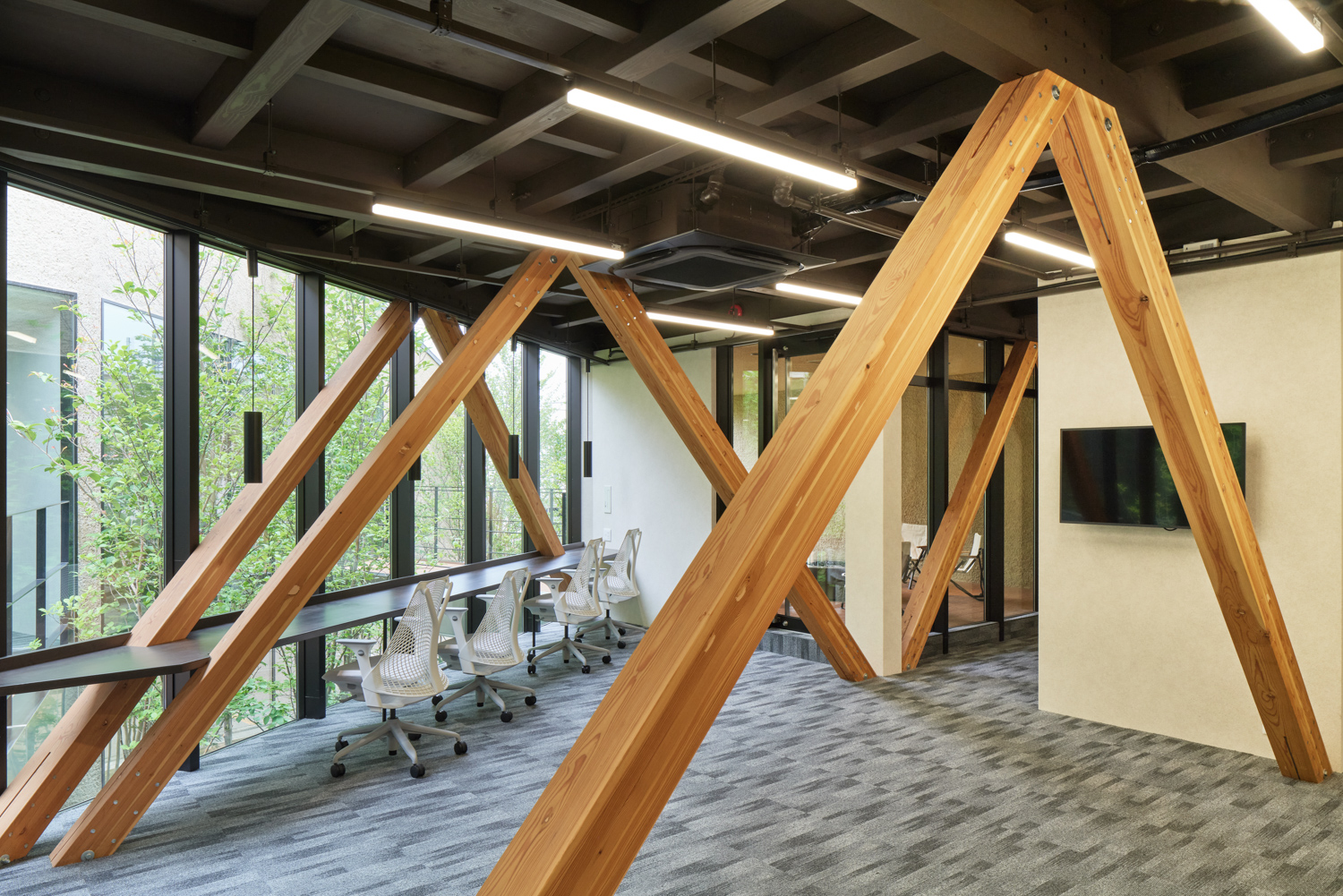 2つの性格の異なるオフィス空間を「パッサージュ(渡り廊下)」が緩やかに繋げていきます。周辺環境のコンテクストで最大の特徴である「キャンチレバー(片持ち)」を実現するために、オーノJAPAN(東京都)に構造設計を依頼。木造トラス架構を各所に配置することで、約5mのキャンチレバーを実現します。
