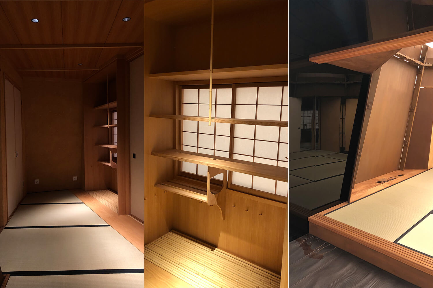 工芸と建築が融合する現代茶室として、茶道裏千家今日庵業躰の奈良宗久氏監修の下、陶芸家の中村卓夫氏、漆芸家の西村松逸氏、金工作家の坂井直樹氏、3名の現代工芸家と議論しながら案はまとめられました。施工は株式会社家元。