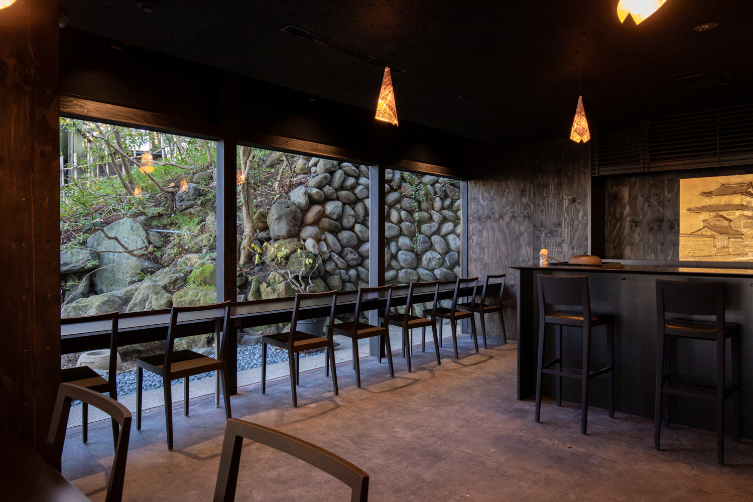かつてこの場所にあった江戸町武家屋敷の風情を感じさせるような、落ち着いた色調で内装を仕上げ、床壁天井すべてを黒く統一し、奥深い空間が来訪者を出迎えます。