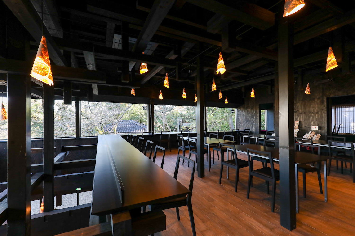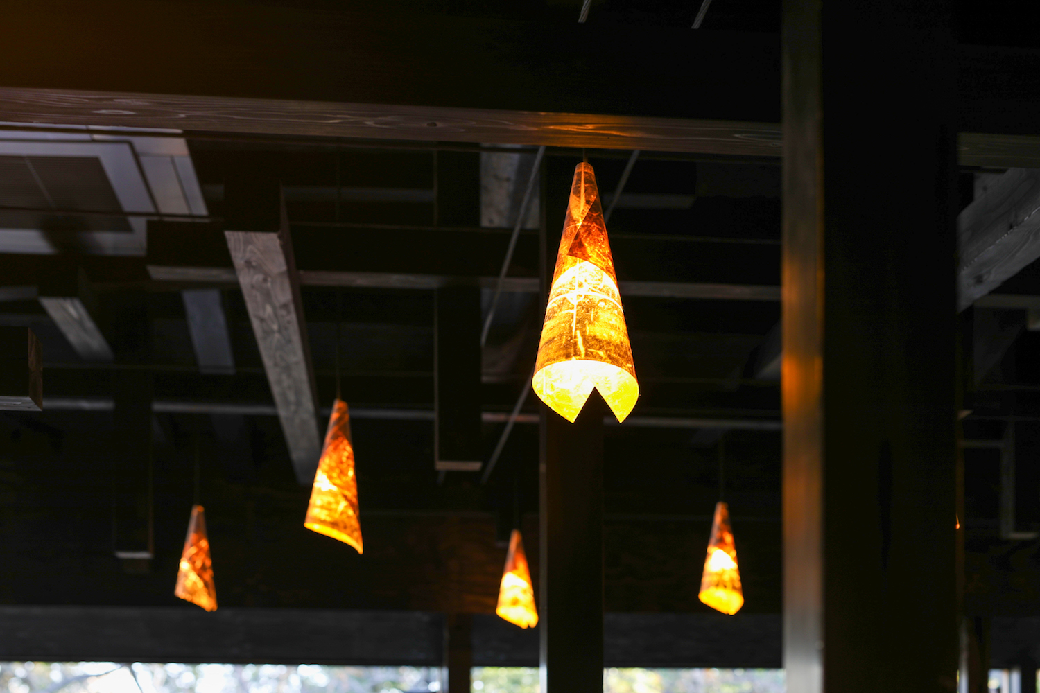 暖簾の布や照明に施された金箔貼りなどの石川県の伝統的な産業・工芸に加えて、小屋組み部分の補強に炭素繊維ロッドを使用するなど、石川県の新旧さまざまな技術がふんだんに活用されています。