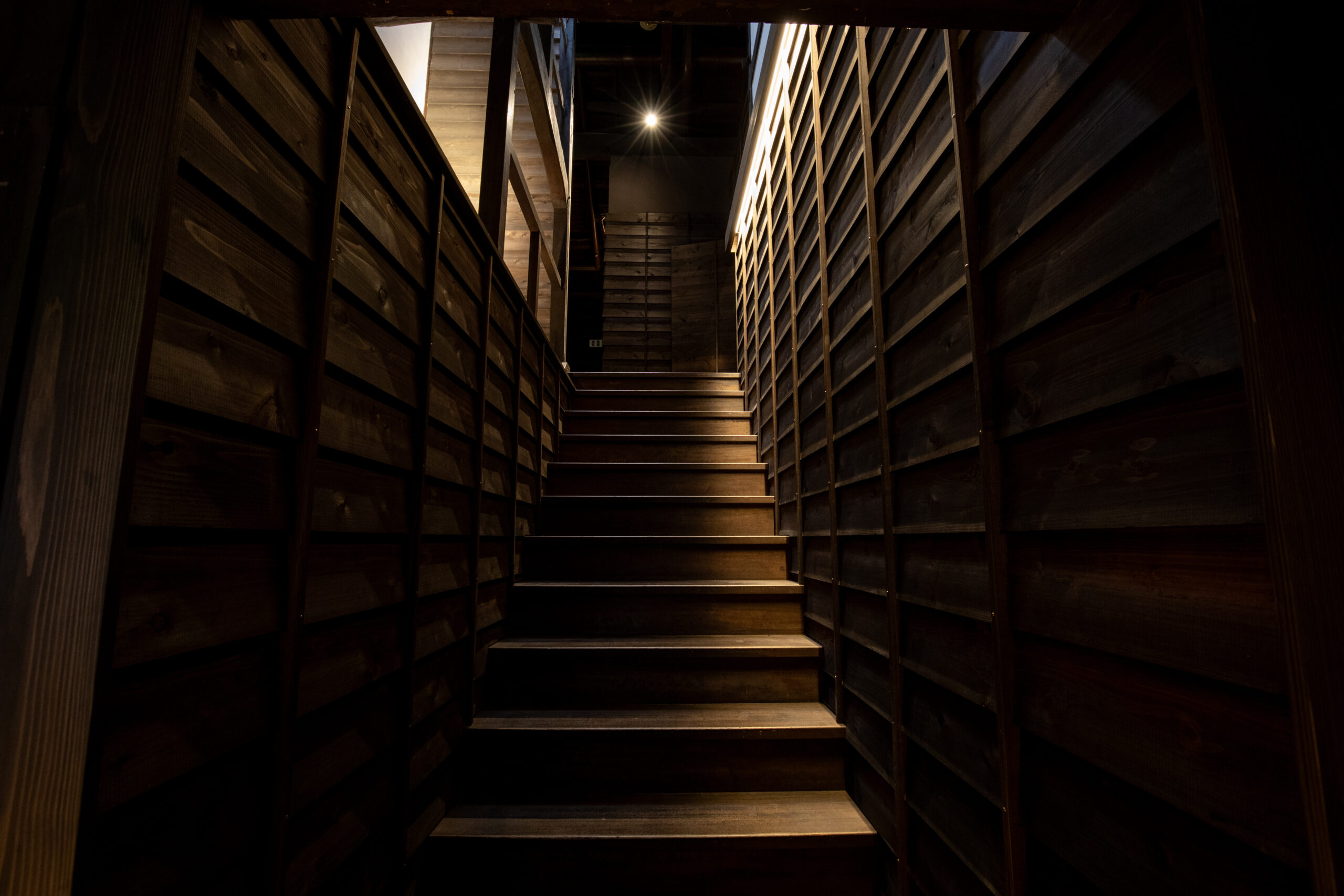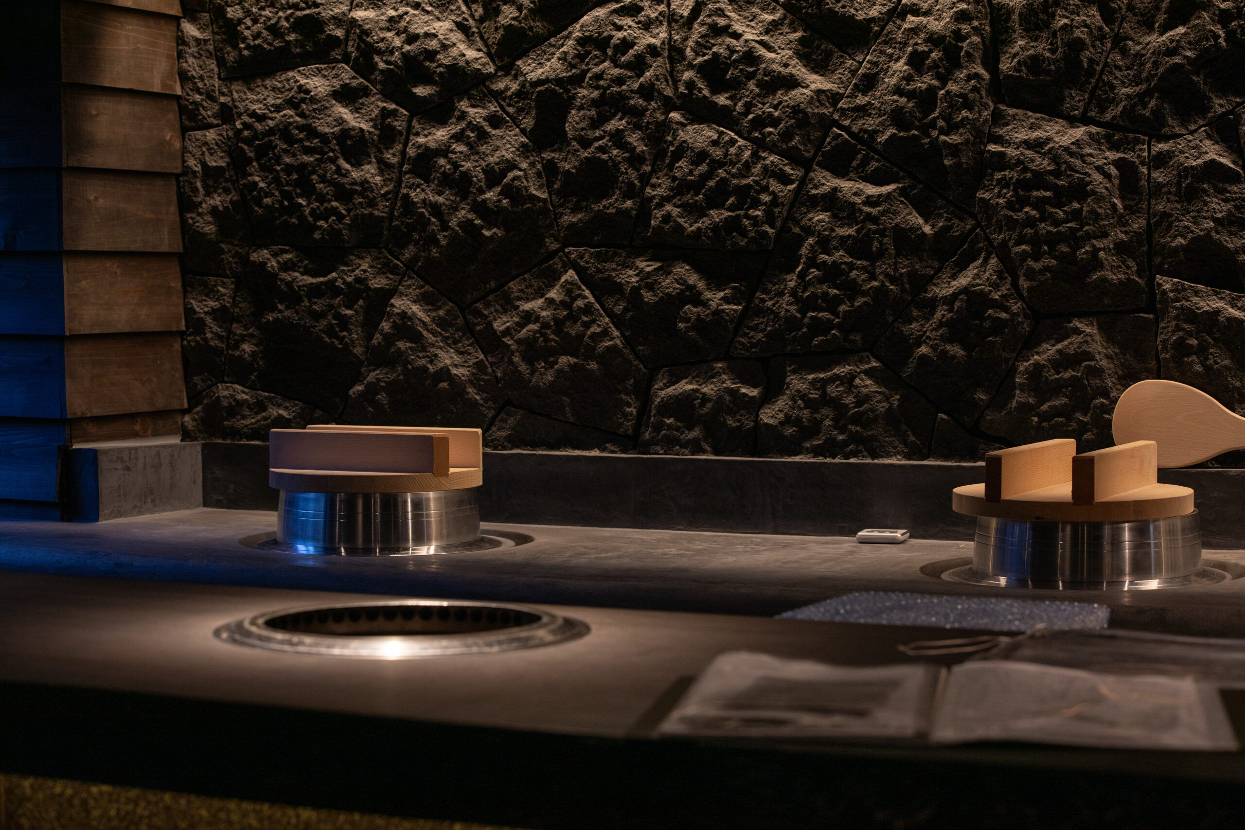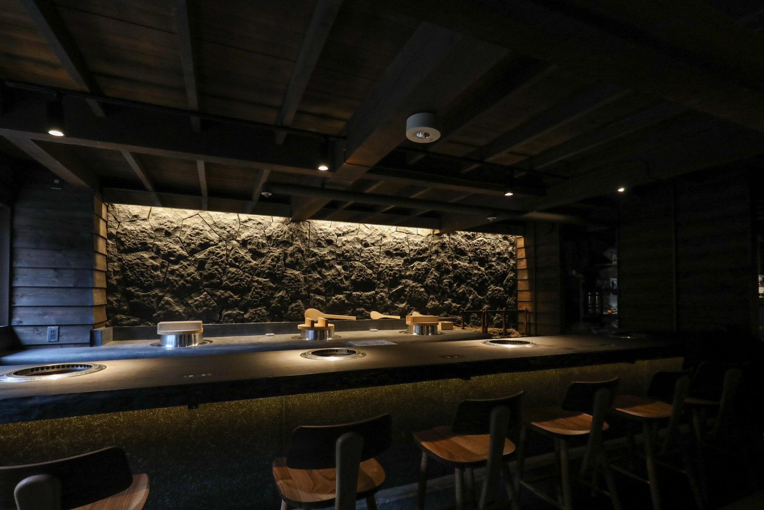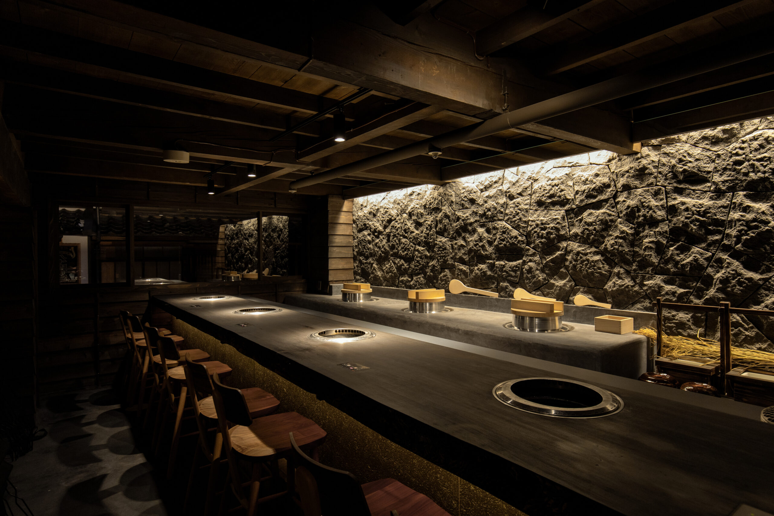 時代の経過が刻まれた躯体は空間に重みと懐かしさを感じさせ、その雰囲気を損なわず、年輪をより引き立てるため、あえて対比する素材を採用してみたり、素材選びやライティングにおいて、空間構成を慎重に努めました。