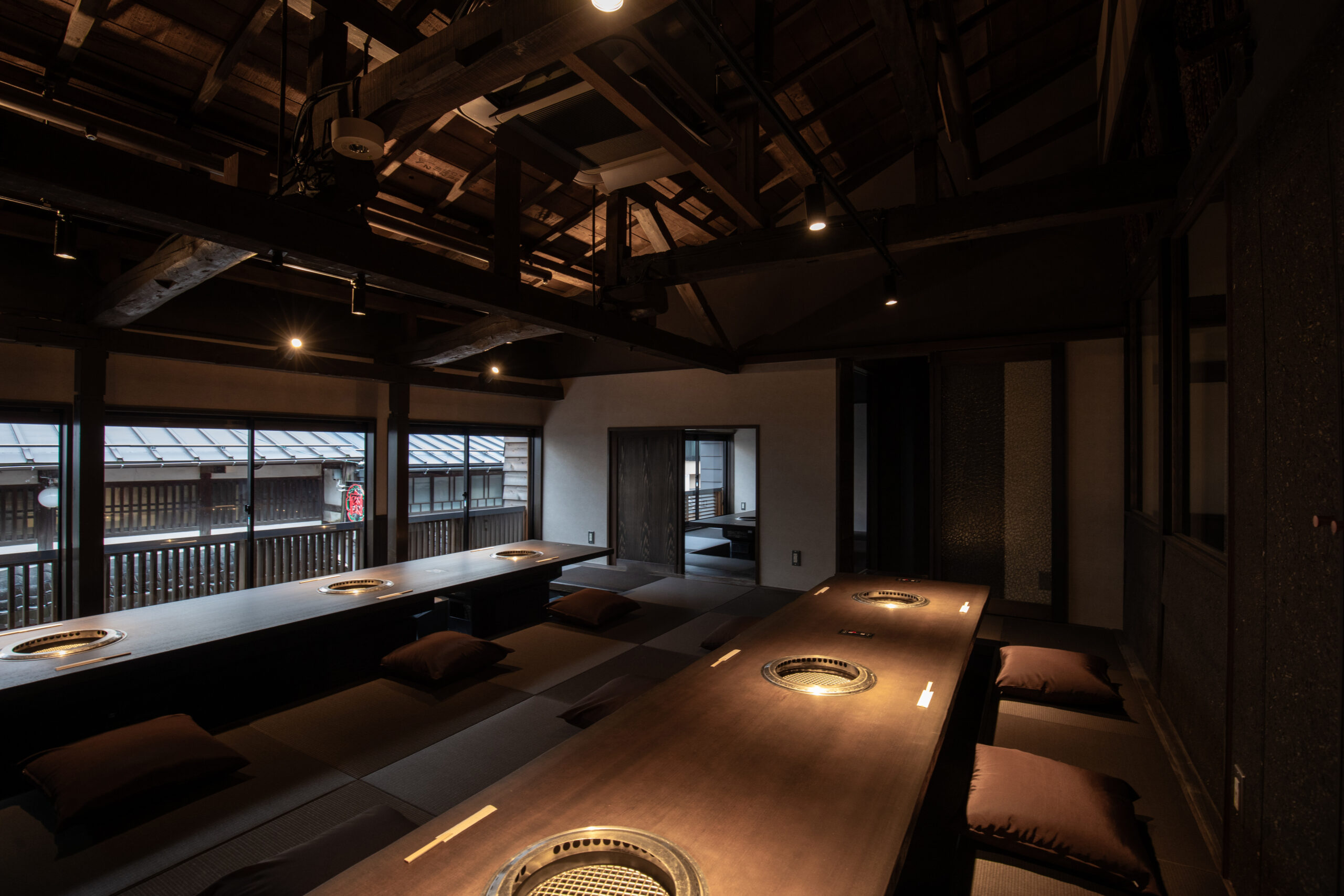 また、伝馬町の街並みを行き交う人々の視線が店内の奥まで延びるようにカウンター席、エントランスホールに奥行を与えたことや路地沿いに配置された2階の広間に対しても、もともと全面を覆われていた目隠し格子を低めに切り詰めて、半透明だったガラスも透明なものに入れ替え、路地から小屋組を見通せるように配慮したことで、ファサードの表面化粧だけが顔となるだけではなく、店内も一体的に店舗の顔となることを意図してデザインしました。