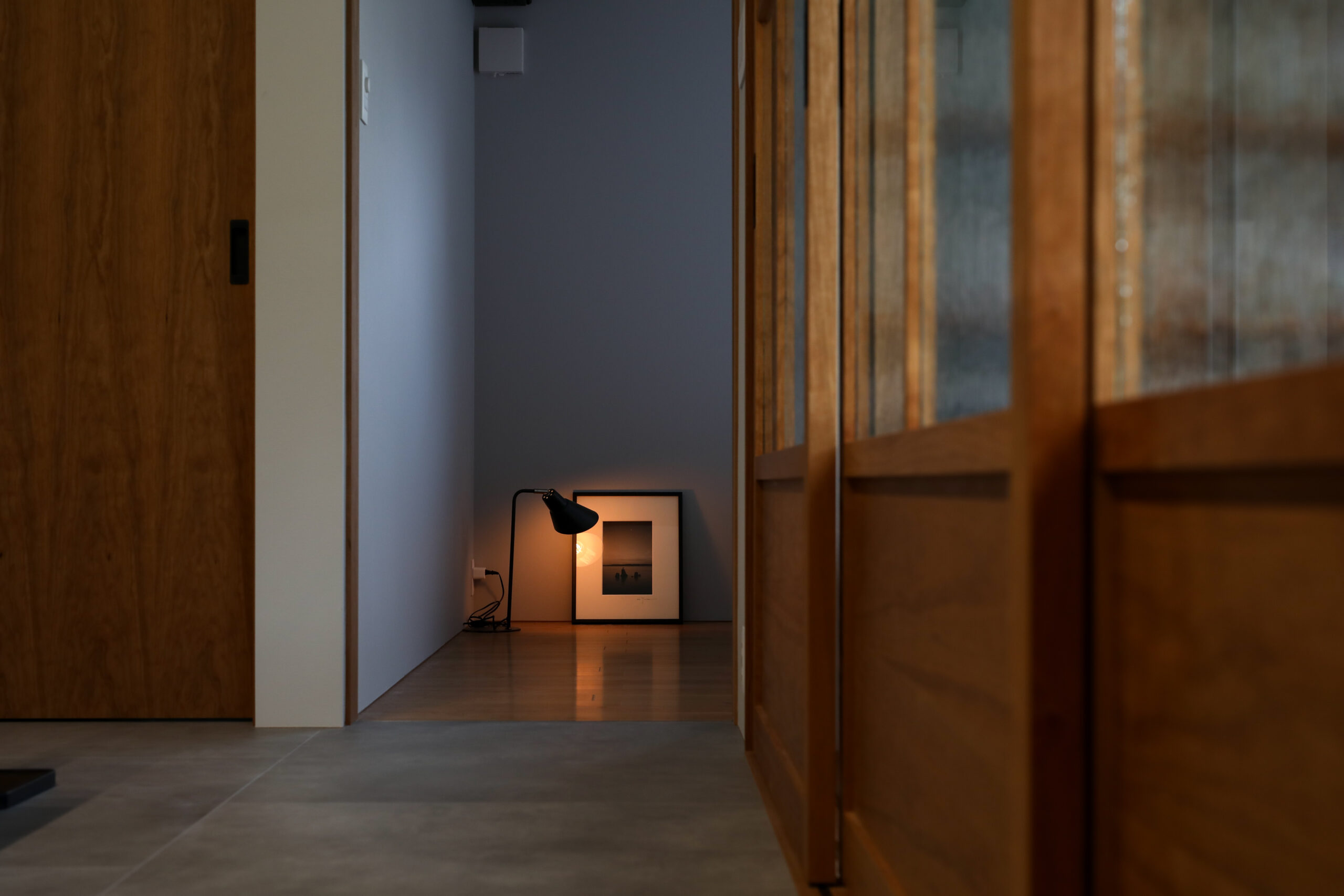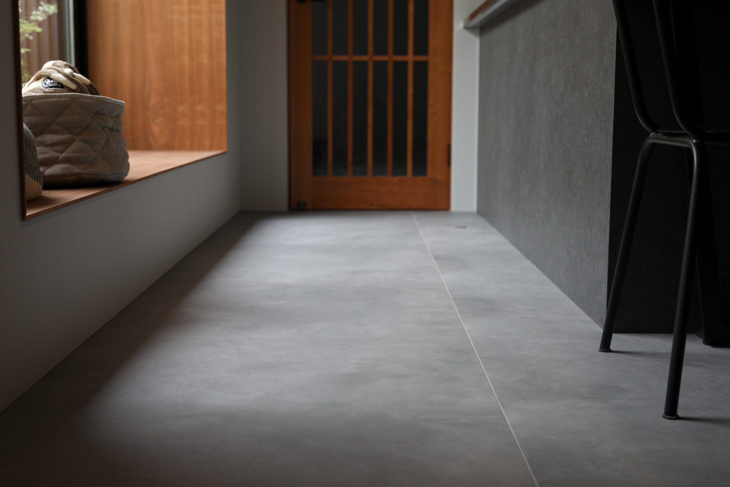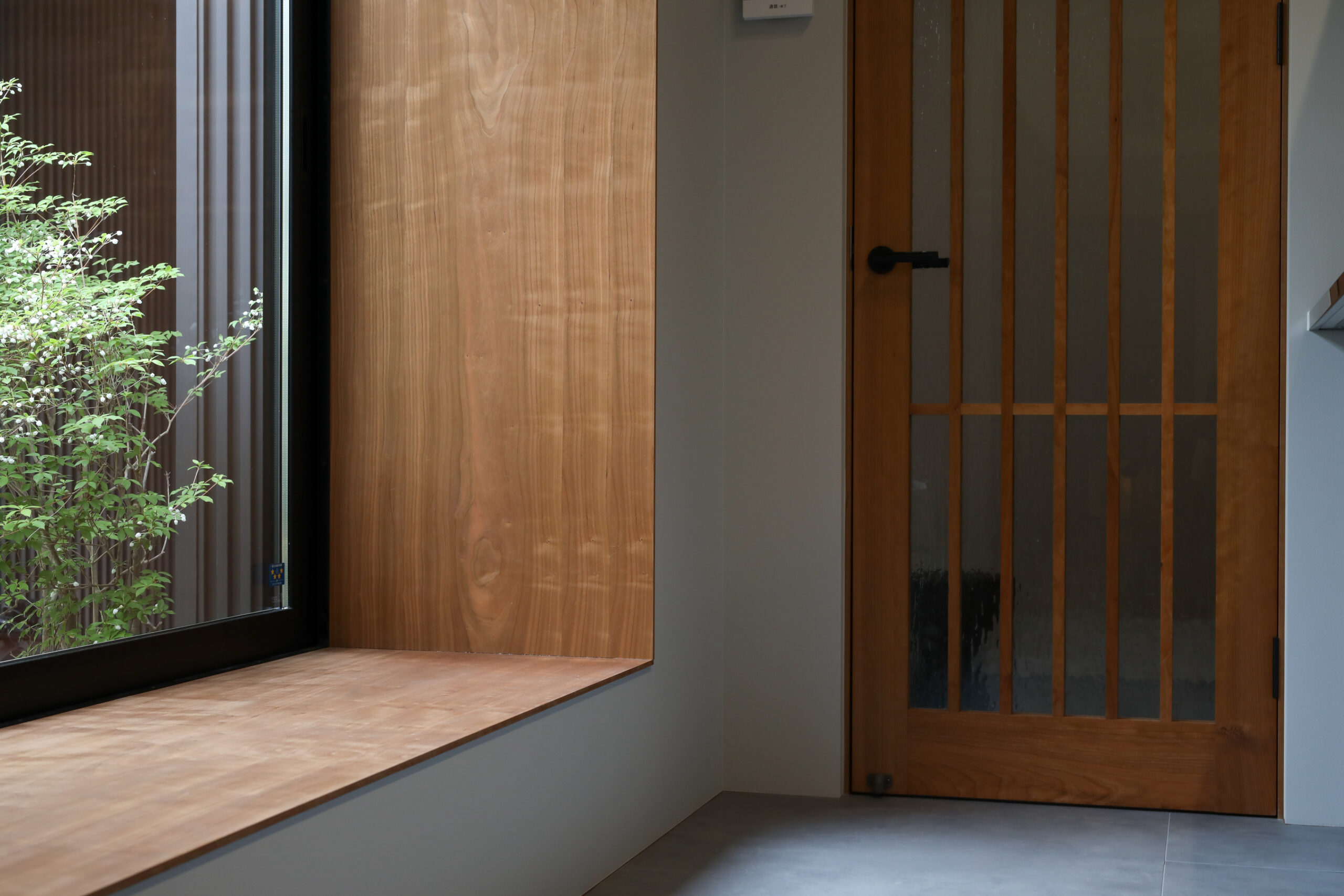 床材はフロアタイルを採用。室内であまり走らないのんびり屋な猫ちゃん達なので、お掃除しやすさを重視しました。造作建具にはブラックチェリーの無垢材を採用。見た目の美しさだけでなく、質感や経年変化まで含めて選ばれました。