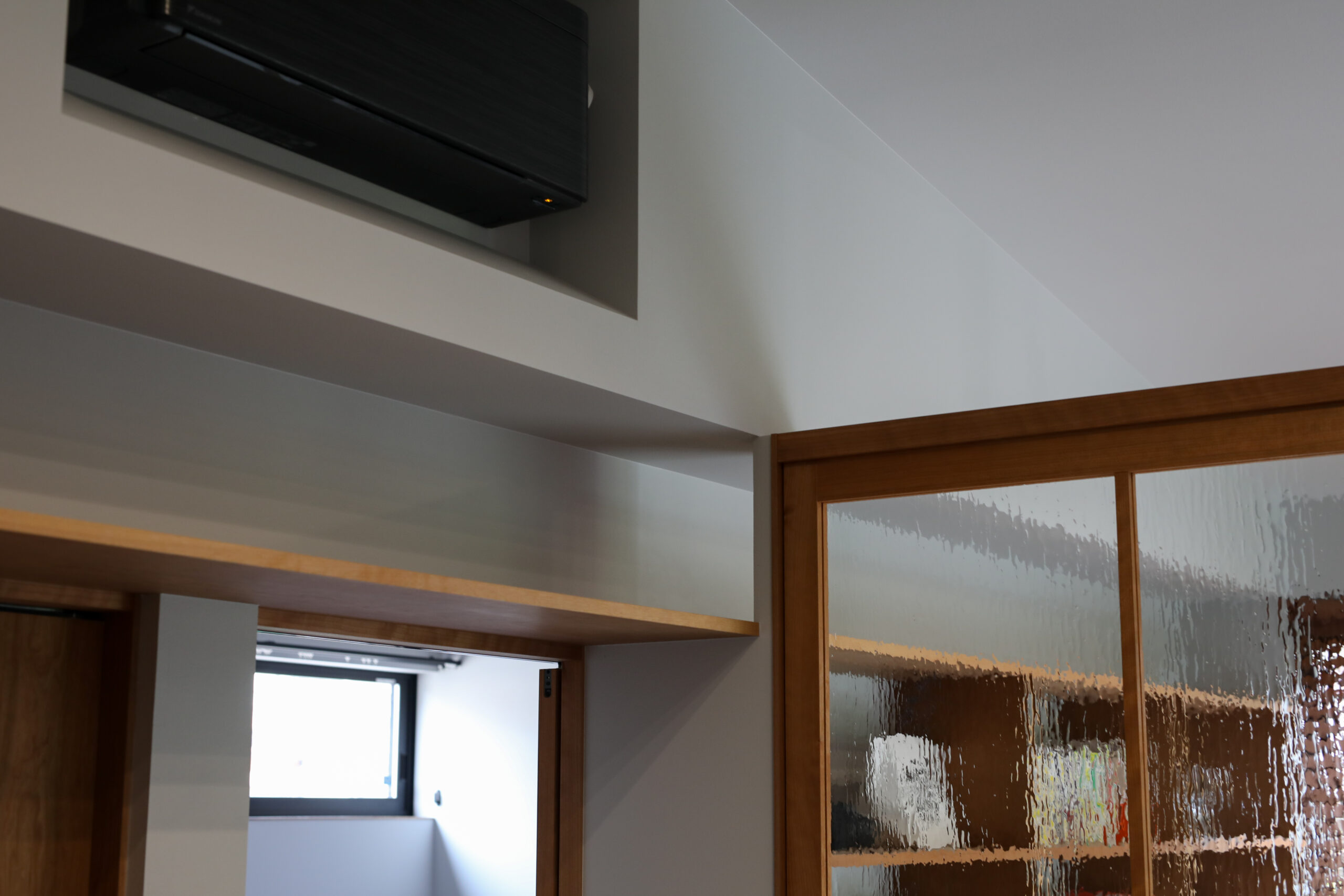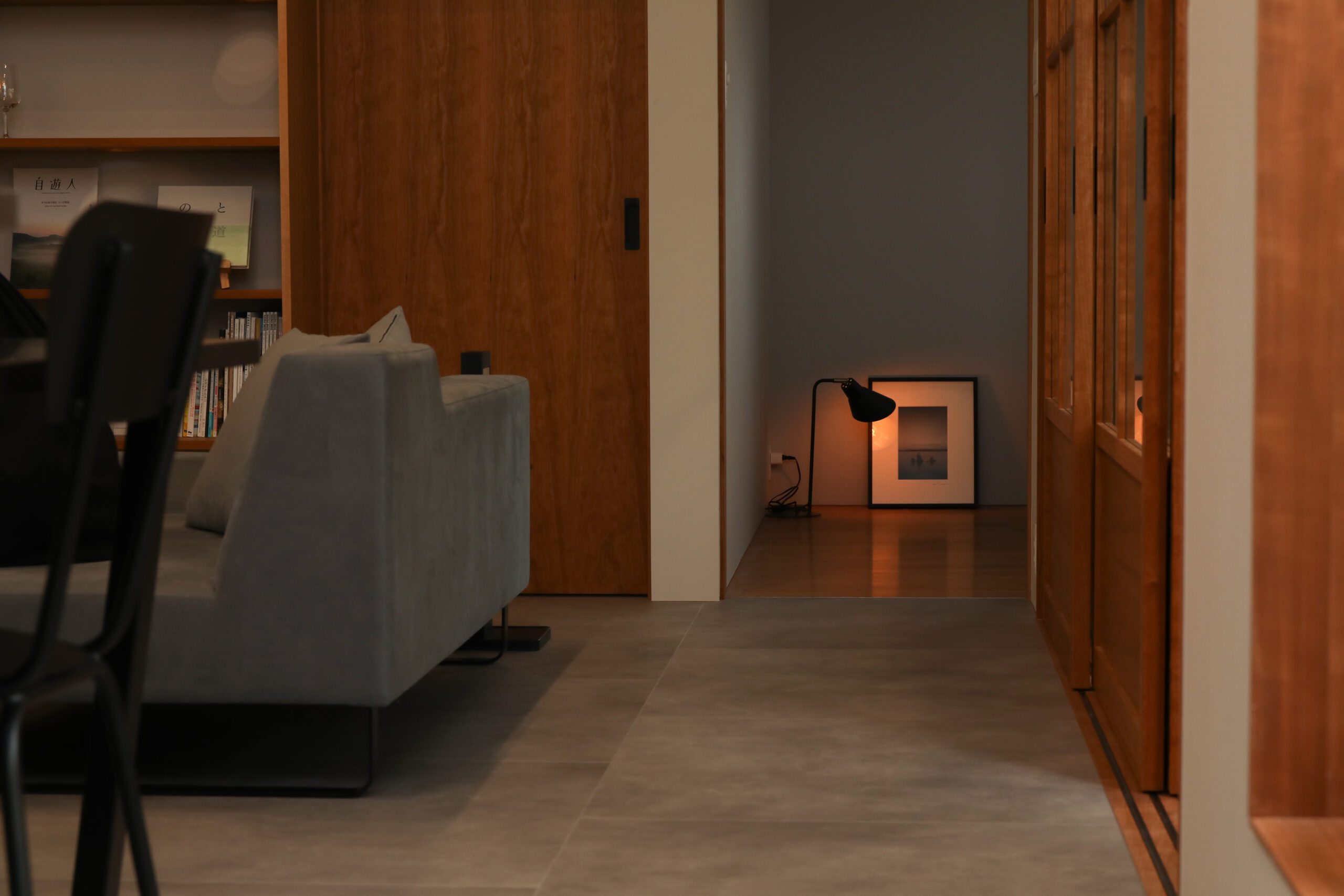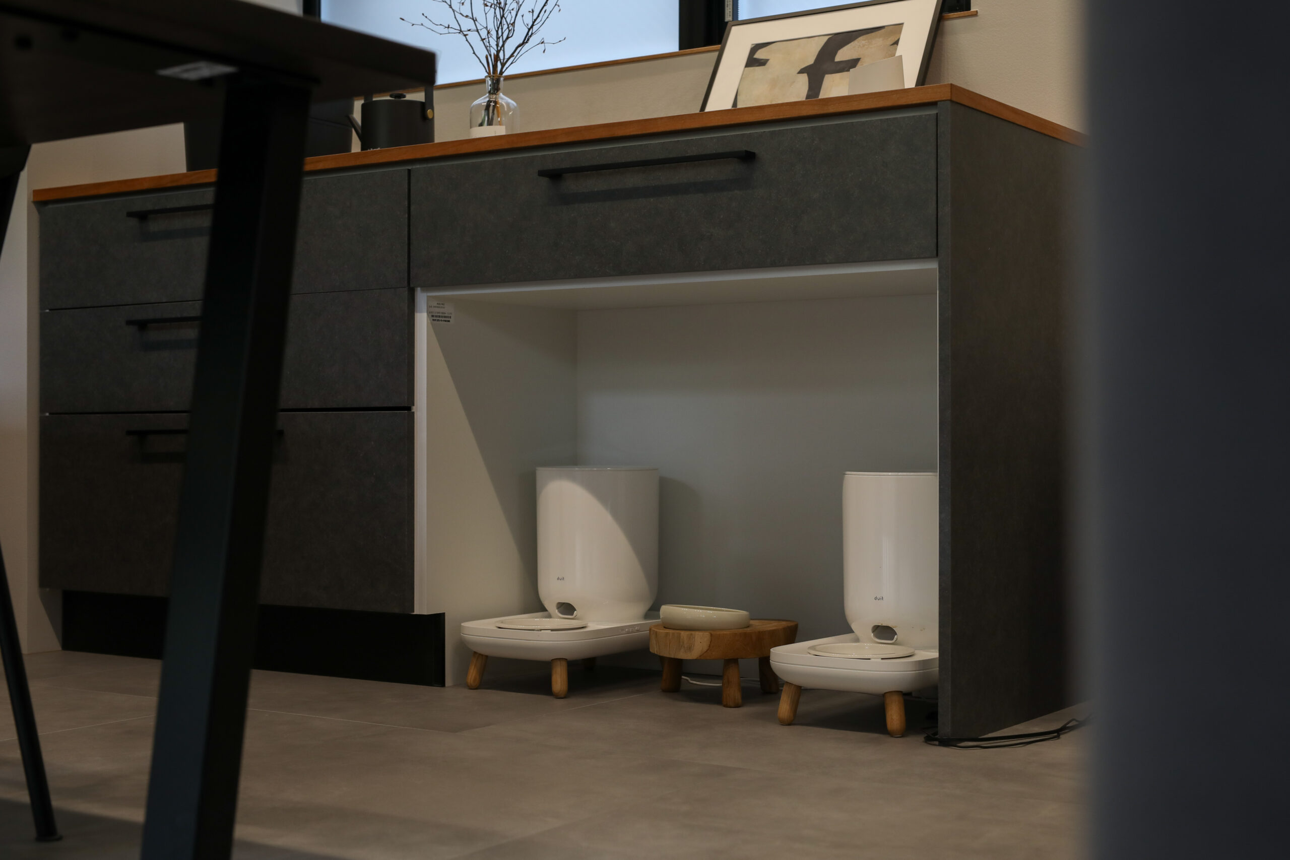 床材はフロアタイルを採用。室内であまり走らないのんびり屋な猫ちゃん達なので、お掃除しやすさを重視しました。造作建具にはブラックチェリーの無垢材を採用。見た目の美しさだけでなく、質感や経年変化まで含めて選ばれました。